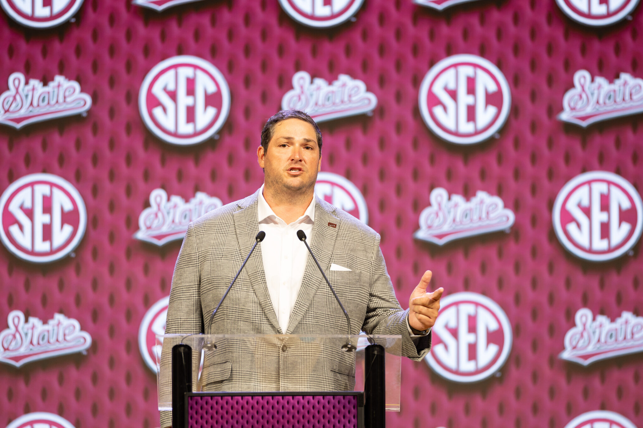 Jul 17, 2024; Dallas, TX, USA; Mississippi State head coach Jeff Lebby speaking at Omni Dallas Hotel. Credit: Brett Patzke-USA TODAY Sports